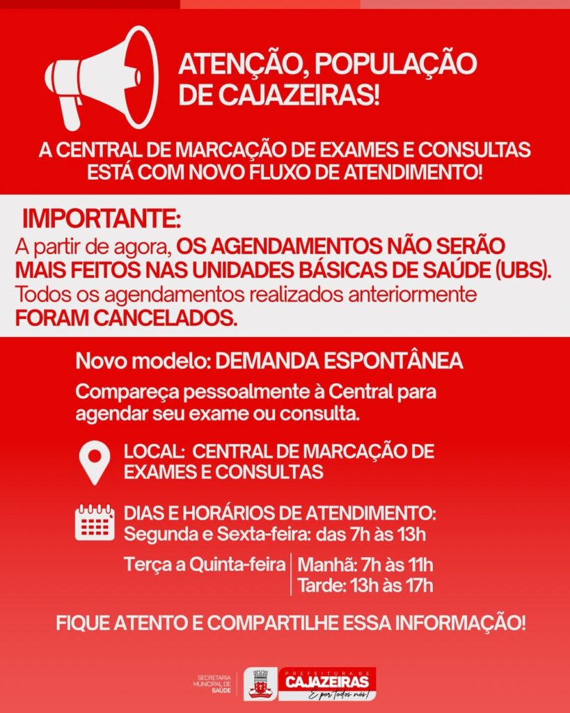 A Prefeitura Municipal de Cajazeiras, no Sertão paraibano, publicou uma nota informando que através de comunicando que a Central de Marcação de Exames e Consultas está com um novo fluxo de atendimento voltado à população.