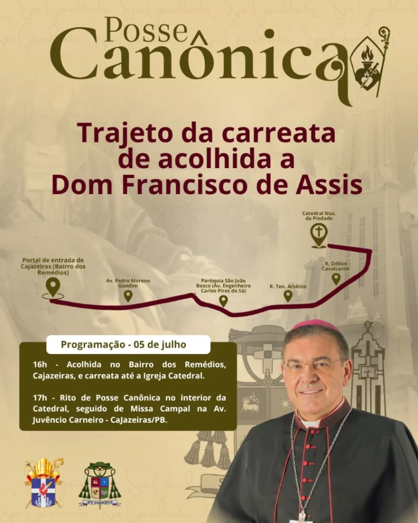 Com programação que será marcada por recepção com acolhida, seguida por carreata até a Igreja Catedral e culminando com Rito de Posse Canônica no interior da Catedral, logo após, Missa Campal na Avenida Juvêncio Carneiro, no Centro de Cajazeiras.