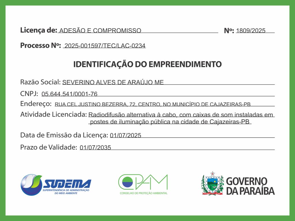 A licença, de número 1809/2025, autoriza o funcionamento da atividade de radiodifusão alternativa à cabo, com caixas de som instaladas em postes de iluminação pública na cidade de Cajazeiras, e tem validade até 2035. A conquista é símbolo de credibilidade, respeito às normas e compromisso com a qualidade do serviço prestado à população.